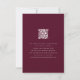 Cartão RSVP de Casamento outono de Boho com Arch de Flor Selvflower - burgundy e creme de marfim Resposta de casamento Floral Cartão com o código qr do site Modelo Este cartão RSVP de casamento outono boho personalizável é um na moda e um aditamento prático ao seu convite de casamento de outono. Apresentando um arco de flor silvestre, pintado manualmente, em tons quentes e úmidos de terracota, laranja queimada, coral, pêssego, rosa mole, roxo, amarelo e numero queimado, complementa perfeitamente os temas de casamento rústicos, boêmicos, jardins e ao ar livre. O elegante design de arco floral traz um toque romântico e inspirado na natureza, enquanto a escritura burgundy moderna e a tipografia num fundo branco nítido tornam fácil de ler e belamente refinado. Personalize esta placa de gabinete RSVP com seus próprios detalhes — os convidados podem responder com o número de participantes, seleções de refeições, restrições de dieta ou alergias à comida. Ideal para casamentos outono, este cartão de resposta é parte de um conjunto de papelaria de casamento de flor silvestre, projetado para se coordenar perfeitamente com seus convites. O modelo fácil de editar garante que você possa fazer atualizações rápidas para se adequar à sua celebração. Apresentando uma obra de arte original por Catherine Sweetman, esta placa RSVP de casamentos outono combina elegância artística com funcionalidade, ajudando você a reunir respostas com estilo e facilidade.