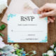 Este Boho Turquoise Poppies e Ferns Wedding RSVP apresenta um elegante, mas moderno design floral com disposições florais aqua bonito em cada esquina. Há também um pequeno arranjo floral no verso do cartão.