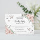 Esta bonito placa floral Quinceañera / Sweet 16 RSVP apresenta flores cor-de-rosa poeirentas pastel, coroa prateada e borboletas. Basta clicar no botão personalizar para editar os textos, alterar as fontes e as cores das fontes. Itens correspondentes disponíveis no repositório. c) Paperie fina somerset
