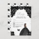 Esta elegante e glamourosa placa rsvp apresenta uma bela princesa com cabelo morena num vestido preto. O texto combina o script manuscrito e as fontes sans serif modernas para um aspecto elegante e sofisticado. Os arranjos florais, borboleta e confete prateado criam a mistura perfeita de rústico e chic. Perfeito para uma doce festa ou festa de aniversário de dezesseis. Gráficos por www.etsy.com/uk/shop/SunflowerDayLove