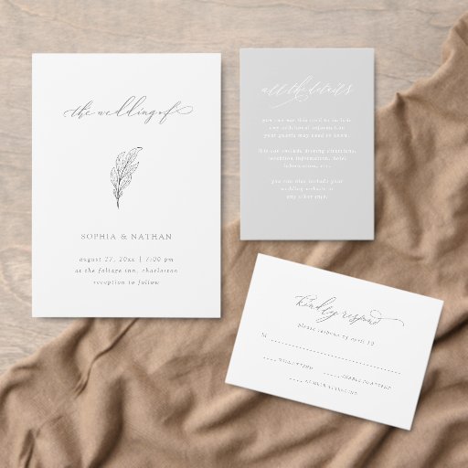 Estes cartões de resposta simples e elegantes apresentam caligrafia de cinza macia e texto moderno num fundo branco nítido. A parte traseira da placa é uma cinza luminosa correspondente. Eles são feitos para coordenar perfeitamente com nossa coleção de casamento "Folha Minimalista".