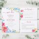 Este design inclui um buquê que flui de cor-de-rosa-escuro, pêssego e cravos amarelos e azul esqueça-me dos pontos. Simples e doce, esta design é perfeita para casamentos informais a semissformais. Este cartão faz parte do conjunto de cartas "Carnação e esqueçam-me", criado pela imprensa "Simply Farmhouse".
