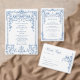 Modelos de casamento elegantes, editáveis e fáceis de usar, mais itens (convites, rsvp, cartões de agradecimento, papelaria e decoração) com o mesmo design estão disponíveis na loja. Para personalização adicional, clique em "Personalizar este modelo", em seguida, "Editar usando a Ferramenta de Design". Cartão de RSVP de Casamento Floral de Jardim Francês Azul Vintage Elegante.