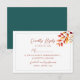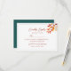 Elegante e sazonal, este cartão de RSVP de casamento de outono em tons de azul-turquesa e laranja apresenta folhagem de outono em aquarela e um layout clássico e simples para coletar as respostas dos convidados. Com espaço para preferências de refeição e data de retorno, é perfeito para coordenar com o conjunto de materiais do seu casamento temático de outono. Totalmente personalizável para combinar com os detalhes do seu evento e estilo pessoal.