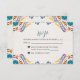 Este design de Cartão RSVP de Casamento Botânico da Nuestra Boda Mexicana apresenta um arranjo floral rico e vibrante ao redor das bordas, com cores ousadas como vermelho, laranja, azul, roxo e amarelo que criam um sentimento festivo e acolhedor. As flores são intricadamente combinadas com padrões folhosos e pequenos e detalhados embelezamentos, dando ao design um olhar vivo e texturizado. O equilíbrio entre cores brilhantes e contrastantes e o arranjo delicado e simétrico fazem disto uma opção atraente para uma papelaria de casamento celebratória, especialmente aquela com um tema tradicional ou folclórico.