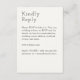 Cartão de resposta RSVP de casamento minimalista, projetado para coordenar com nossa coleção de artigos de papelaria "moderna". Apresenta uma tipografia nítida e limpa sobre uma seleção curada de cores de fundo contemporâneas, criando uma estética impressionante, mas subestimada. Misturar cores e combinar com outros produtos de papelaria para criar a sua suíte perfeita de papelaria de casamento. Totalmente personalizável e fácil de personalizar, esse conjunto de placas de gabinete é perfeito para aqueles que valorizam o design elegante e a sofisticação sem esforço para seu dia especial. Veja o resto da coleção em nossa loja. ✦ ✦ ✦ Entre em contato conosco para obter assistência na personalização ou personalização para ajustado de seus desejos individuais. Ou, para ajudar a personalizar ou criar produtos de papelaria de casamento relacionados.