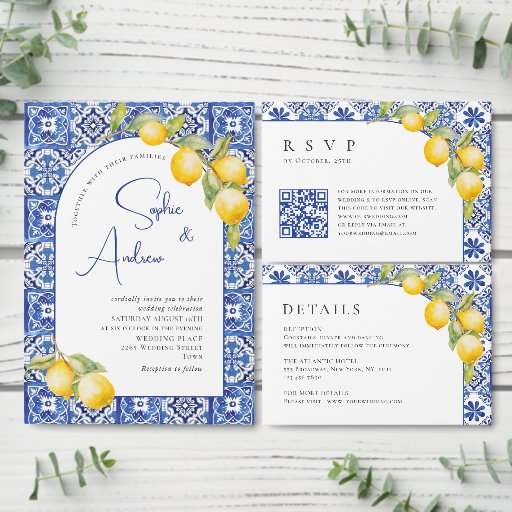 Cartão RSVP Casamento de Azulejos Azuis de Limões do Mediterrâ