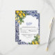 A mão pintou azulejos tradicionais de Portugal design com limões mediterrânicos. Trabalho de arte azul azulejo e azulejo floral branco. Um belo design mediterrânico que representa os limões amarelos com o seu verde e floresce contra um padrão português azul e branco. O texto do casamento é elegantemente enquadrado com uma forma geométrica branca. Design de cartão RSVP de casamento floral azul e branco único Azulejo com elementos modernos. Os convites de casamento e outros artigos de papelaria também estão disponíveis.