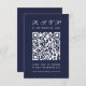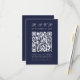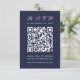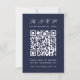 Um simples RSVP de casamento azul marinho com um grande código QR no centro e o título escrito em caligrafia. Todo texto é branco. É vertical, orientado para retratos.