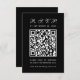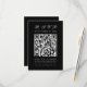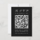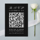 Um simples RSVP de casamento preto e branco com um grande código QR no centro e o título escrito em caligrafia. O fundo é preto, todo texto é branco. É vertical, orientado para retratos.