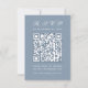 Um simples RSVP de casamento azul empoeirado com um grande código QR no centro e o título escrito em caligrafia. Todo texto é branco. É vertical, orientado para retratos.