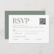 Cartão RSVP de casamento verde de sábio elegante com um código de QR digitalizável para o site e 3 opções de refeições editáveis. O exemplo inclui cardápios de carne, peixe e vegano, mas pode ser mudado para qualquer outro texto. Personalize com seu próprio texto.