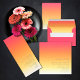 O pano de fundo de todas as peças neste conjunto minimalista de casamento é um gradiente de cores que vai do fundo do rosa a rosa através da tangerina e do amarelo ao branco. A placa RSVP de casamento mostrada aqui apresenta um layout moderno e elegante e fonte sans serif contemporânea para adicionar ao seu apelo. Adicione facilmente os detalhes do evento usando o modelo fornecido. Procure ID741 para ver o conjunto completo de produtos correspondentes no Verão Quente ou escolha uma das outras combinações de gradiente disponíveis para se adequar à paleta de cores do casamento.
