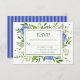 Este charmoso e elegante cartão RSVP com hídrangas azuis lindas, sábia e multicêntricas e uma espantosa folhagem verde e a coordenação da risca azul é perfeito para se juntar aos vossos convites. Seus convidados acharão fácil responder ao seu casamento. É uma excelente escolha para qualquer primavera ou noiva de verão. Você pode facilmente torná-lo seu, selecionando Personalizar este modelo e digitando no prazo de resposta. Em segundos você verá suas placas RSVP únicas e impressionantes!