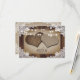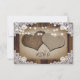 Cartões RSVP de Casamentos Rústicos Românticos inspirados em madeira rústica, burlap e renda. Personalize facilmente estes cartões de resposta de casamentos de países rústicos, antigos, com corações em burlap, em um púlpito angustiado e madeira rústica, enfeitados com luzes de cordas e rendas florais brancas.