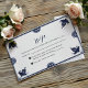 Este design de Cartão RSVP de Casamento de Fiesta Simples (Otomi Simple Fiesta Simple) Azul Mexicano apresenta uma borda simples e elegante, com floral azul escuro e elementos de pássaros delicadamente colocados em cada esquina. A área central é vazio à esquerda, enquadrada por uma fina linha azul, que fornece um pano de fundo limpo e minimalista para o texto. A combinação de pássaros e flores, com o uso restrito da cor, dá à design um olhar sofisticado, porém tradicional, inspirado nos mísseis folclóricos mexicanos.