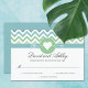 Um RSVP de casamento contemporâneo que apresenta um design chevron com listras verdes e azuis de maçã, enfeitado com um coração branco pierced por uma seta em uma fita azul.