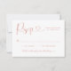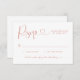 O ouro rosa moderno e o branco (as cores podem ser modificadas) cartões RSVP de casamento apresentam um design de tipografia na moda com script de caligrafia e sotaque cardíaco. O texto personalizado simples e elegante que pode ser personalizado com a data de vencimento do RSVP. O design inclui uma linha para nome(s) de convidado, participação de evento e o número total de convidados presentes.
