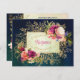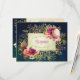 Este cartão de cercado RSVP de casamento floral vitoriano tem estilo e charme antigos em um esquema de cor d'água ousado de marinho azul-da-meia-noite, azul-lacre e verde Hunter. Por cima das cores ricas estão camadas de folhagem dourada esticada e verde com ilustrações de linhagem floral de flores e plantas com uma estrutura retangular com borda dourada e uma bela e ornamentado estrutura de rolagem dourada que tem a palavra "Resposta" em fúcsia rosa no centro. Nos cantos superior direito e inferior esquerdo estão grandes buquês de rosas, peônias, folhas, samambaias e outras flores coradas em cor-de-rosa profundo, coral, creme, marfim, branco, pêssego, azul, roxo, vinho e verde. A parte de trás desta inserção de cartão de resposta floral de casamento vintage usa a mesma cor, flores e folhagem que está no convite de casamento correspondente, somente as flores estão no lado esquerdo para que todos os detalhes de RSVP possam preencher a área restante, que inclui seleções de entrada, se necessário, ou você pode usar este cartão de tamanho A2 como uma recepção e/ou um cartão de acomodação ou de instruções com todos os detalhes em fuchsia pink e azul . Se você precisar de outros itens correspondentes, envie seu pedido por e-mail para niteowlstudio@gmail.com ou use o recurso de bate-papo Zazzle para entrar em contato.