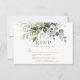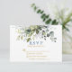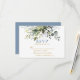 A Carta RSVP de Casamento Botânico Elegante Moderno de Aquarela Botânica inclui folhas de eucalipto, folhagem botânica verde, folhas azuis empoeiradas e outros belos lençóis botânicos. Azul empoeirado Fundo, Texto Dourado