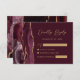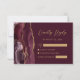 Esta placa de RSVP de casamento moderna apresenta uma borda vermelha de cor-d-água borrifada com brilho dourado num fundo burgundy. O texto está em um roteiro de caligrafia moderna de cor dourada e fonte sans serif, com espaços para nomes e respostas de convidados. O lado inverso apresenta uma burgundy e uma design de agata dourada.