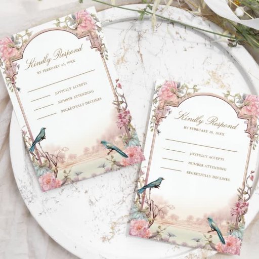 Cartão RSVP de casamento elegante com lindas flores e pássaros fofos.