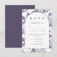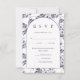 Cartão rsvp de casamento simples e elegante apresenta um lindo padrão botânico violeta colorido no verso, e uma tipografia arrojada clássica na frente branca do cartão. A escolha das refeições e a data de resposta estão incluídas no texto editável.