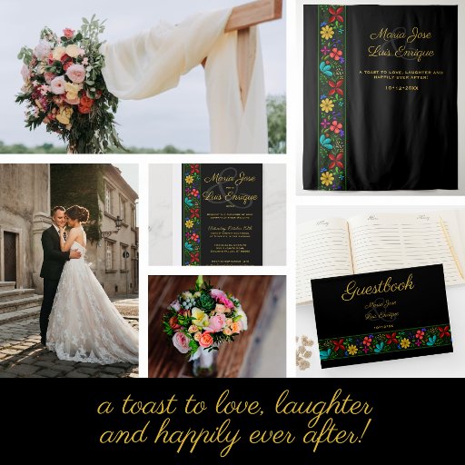 Design romântica e elegante com uma delicada fita floral como detalhes no lado esquerdo, sobre fundo preto. Todos os textos em tipografia dourada são personalizáveis para você personalizar seu casamento, obrigado anotem detalhes. O brilhante e vibrante design floral de Suki foi inspirado por artistas equatorianos de bordados folclóricos residentes na região de Los Andes, na América do Sul. Nota para transferência de design para outros produtos: Coloque as camadas design, uma ao lado da outra, quantas vezes for necessário para alcançar o comprimento desejado.