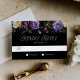 Cartão de noiva floral elegante, RSVP, com um buquê de flores roxas e marfim, folhagem verde esmagadora e bagas escuras no topo da design. "Resposta gentil" aparece na elegante e moderna tipografia. Personalize o cartão de cercado RSVP de casamento gótico com a data de resposta desejada. A placa RSVP exclusiva reverte para exibir um padrão floral correspondente. A design coordena-se com a nossa coleção de casamentos Moody Gothic Floral.
