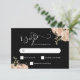 Esses impressionantes cartões de resposta rsvp de casamento apresentam buquês de canto de flores esmagadas, aquarelas em tons de terra neutra cores como bege, pêssego, rosa poeirento e verde macio com sotaques e folhas de ouro sujo e caligrafia moderna. Um elegante olhar floral de vassoura sobre um fundo preto escuro.