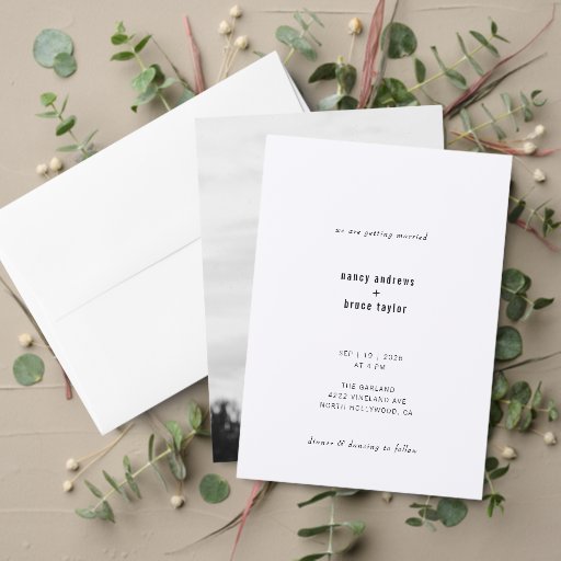 Um cartão RSVP on-line de casamento preto e branco muito mínimo e moderno, com baixa tipografia, texto personalizado e código QR. Um modelo de papelaria de casamento super mínimo e moderno para deixar você como um casal e sua mensagem brilhar. Convites de casamento correspondentes disponíveis no meu compro.