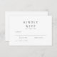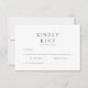 Esta elegante carta de RSVP formal de casamento é a maneira perfeita de reunir respostas de seus convidados com estilo de eterno. Projetado com um layout branco e preto limpo e uma tipografia refinada, ele oferece um formato simples, mas sofisticado, para os convidados indicarem sua presença. Ideal para casais que preferem uma abordagem minimalista e clássica, esse cartão de resposta complementa uma ampla gama de temas de casamento, do tradicional ao moderno. Uma bela e prática adição à sua suíte de papelaria de casamento, garante que seu planejamento de celebração seja organizado e na moda.