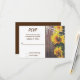 Este cartão RSVP de casamento russo apresenta três lindos girassóis amarelos com folhas verdes e luzes de cordas. São colocados contra um fundo de madeira falsa angustiado. ~