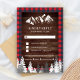 O tema Elegante da floresta, RSVP, com placa de neve coberta de pinheiros e montanhas rochosas com tipografia ocular. Sacudir a placa para revelar um padrão de xadrez de búfalo vermelho na parte traseira da placa.