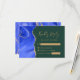 A borda esquerda deste elegante cartão de cercado RSVP de casamento moderno apresenta uma borda real azul de aquarela agata, aparada com falso brilho dourado. O título "Resposta gentil" aparece no script de escrita manual, com texto personalizável abaixo na fonte em cores douradas em um fundo verde esmeralda. O lado inverso apresenta um design real azul e dourado.