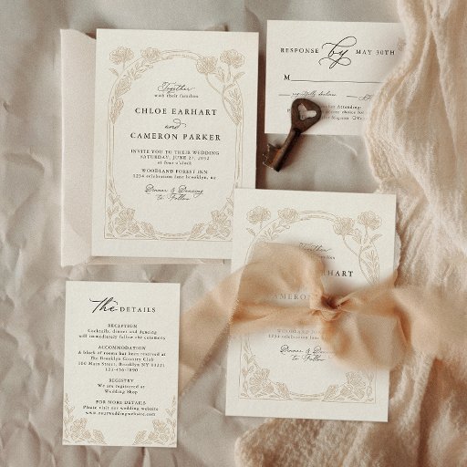 O design apresenta caligrafia elegante e vintage inspirada em fontes de escrita tradicionais. O design inclui delicadas flores desenhadas à mão inspiradas em treliças de jardim com rosas, flores e folhas entrelaçadas. Minimalista e elegante, perfeito para casamentos tradicionais e de jardim.