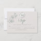 Confirmação de Casamento | Casamento Botânico Geométrico com Monograma de Eucalipto Silver Sage - Folhas de eucalipto transparentes em dólar de prata em tons de verde salvia com uma caixa geométrica prateada moderna em um ângulo de 45 graus segurando um aviso quadrado esbranquiçado para o quadro do monograma - tudo sobre um fundo bege quente de café com leite. Outro design de noiva criado por © WhimsicalArtwork™ Uma abordagem lúdica da tipografia no texto - com as iniciais do nome da noiva e do noivo cercadas por um quadrado geométrico - em duas cores (salvia e prata) - seguido por fontes modernas coordenadas.