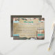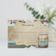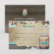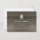 Cartão de Resposta de Recepção de Casamento em Pote de Pedra Rústico. Deixe todos os seus convidados responderem com estilo com esses Cartões de Resposta de Recepção de Casamento em Pote de Pedra Rústico. Apresenta um fundo de madeira marrom com elementos florais nas bordas. Um rótulo com fundo semelhante a papel pergaminho contém todo o texto de resposta em fontes serifadas e sem serifa. Um fundo azul com bolinhas está atrás do rótulo. No verso, há o fundo de madeira com um pote de pedra que contém o texto RESPOSTA. Abaixo do pote, está o local do casamento.