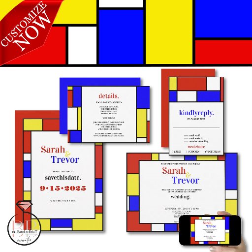 Um convite para casamento retrô divertido e divertido que é tão divertido quanto você é - um olhar nostálgico para o médio Sessenta com uma legal fonte em negrito emparelhada com cores primárias de amarelo, azul e vermelho esboçado em preto em formas geométricas no estilo de Mondrian.