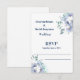 Este cartão RSVP de casamento é mostrado no livro branco do cartão matte com um layout moderno de um impressão de arte aquática de lindas flores azuis e brancas. Texto em uma cor azul Marinho. Personalize este item, retirando o texto do exemplo e colocando suas informações nele. Imagem de ações. freepik.com