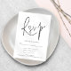 Placa RSVP de Casamento Branco Negro Moderno. Uma tipografia de na moda set em preto para o título principal RSVP complementando o resto do texto que você pode personalizar facilmente.
