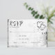 Cartão rsvp de casamento de latido de pássaro branco com dois corações entalados no latido. Pretos e brancos, com simples assento, "irão, não irão", e um lugar para listar os vestidos, se necessário.