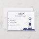 Um cartão RSVP elegante e simples com uma ilustração de um farol em tons azuis marinho para um casamento sobre temas marítimos e náuticos! Troque informações e envie para seus convidados!