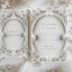 Este cartão de RSVP é um testemunho do grandioso design barroco, convidando seus convidados a responder com a mesma opulência que vai desonrar seu dia de casamento. O cartão é adornado com uma luxuosa coleção de esmaltes brancos esculpidos e folhas de acanthus, criando uma estrutura tridimensional e rica em um fundo sutil de creme. O oval central proporciona um espaço para texto personalizado, com uma fonte simples, mas elegante, que complementa o detalhamento intrincado. Este cartão RSVP não só serve o seu propósito, como também atua como uma guardiã da celebração esbanjadora a vir, concebida para deixar uma impressão duradoura de antecipação e grandes festividades.