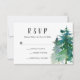 Cartão RSVP de Casamento Montanhês com opção de atendimento numérico. O cartão é decorado com pinheiros altos à direita do cartão. O verso da carta inclui uma bela cena de montanha aquática com água e uma floresta de pinheiros no primeiro plano. Este cartão de resposta de montanha rusticado corresponde a uma coleção na minha loja.