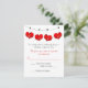 Este cartão de resposta de casamento preto e branco, divertido e bonito, tem quatro corações vermelhos pendurados no topo do convite como o bunting, com as letras RSVP sobre eles. Corresponde ao convite de casamento mostrado abaixo.