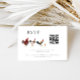 Cartão RSVP de casamento russo e boho com ilustração aquosa de galinhas. Há também um código QR.