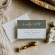 Este cartão de cardápio verde-boho de oliveira é perfeito para um casamento minimalista. A design boêmica moderna de tom verde-escuro de madeira apresenta caligrafia rustica simples com um estilo único, mas clássico. Inclua as opções de refeição para sua recepção na placa do compartimento.
