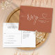 Um guião cardíaco elegante num cartão de RSVP de fundo de terracota. O inverso apresenta os seus detalhes e uma solicitação divertida de música de convidado. Projetado por Thisnotme©