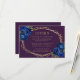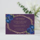 Este elegante cartão de detalhes do casamento moderno apresenta um quadro geométrico dourado decorado com flores azuis reais. O texto dourado personalizável aparece em um fundo roxo. O reverso é roxo sólido.